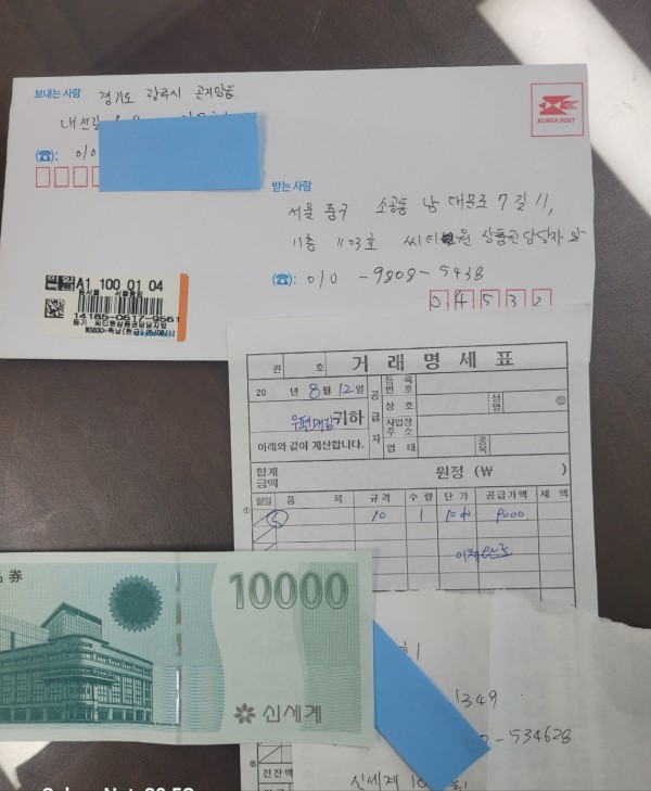경기도 광주 신세계백화점 상품권 우편 도착 했습니다.