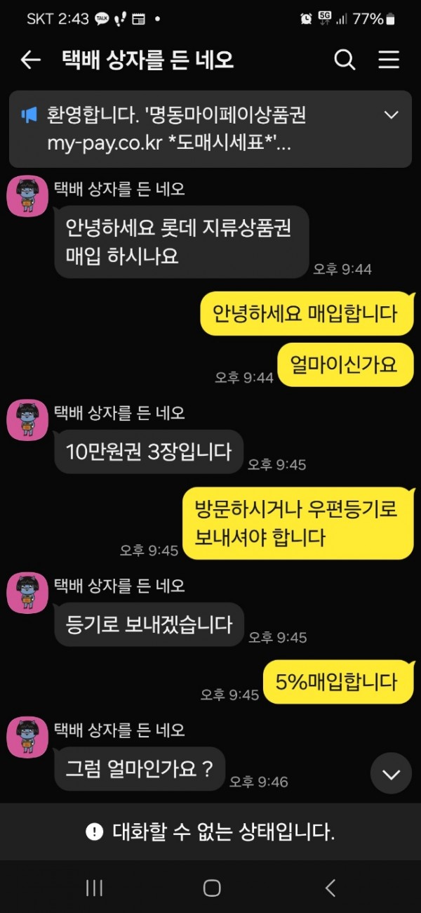 광주 광산구 신창로 고객님 롯데 상품권 우편 거래 완료