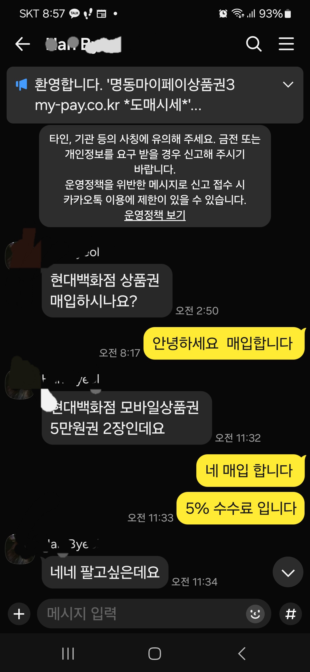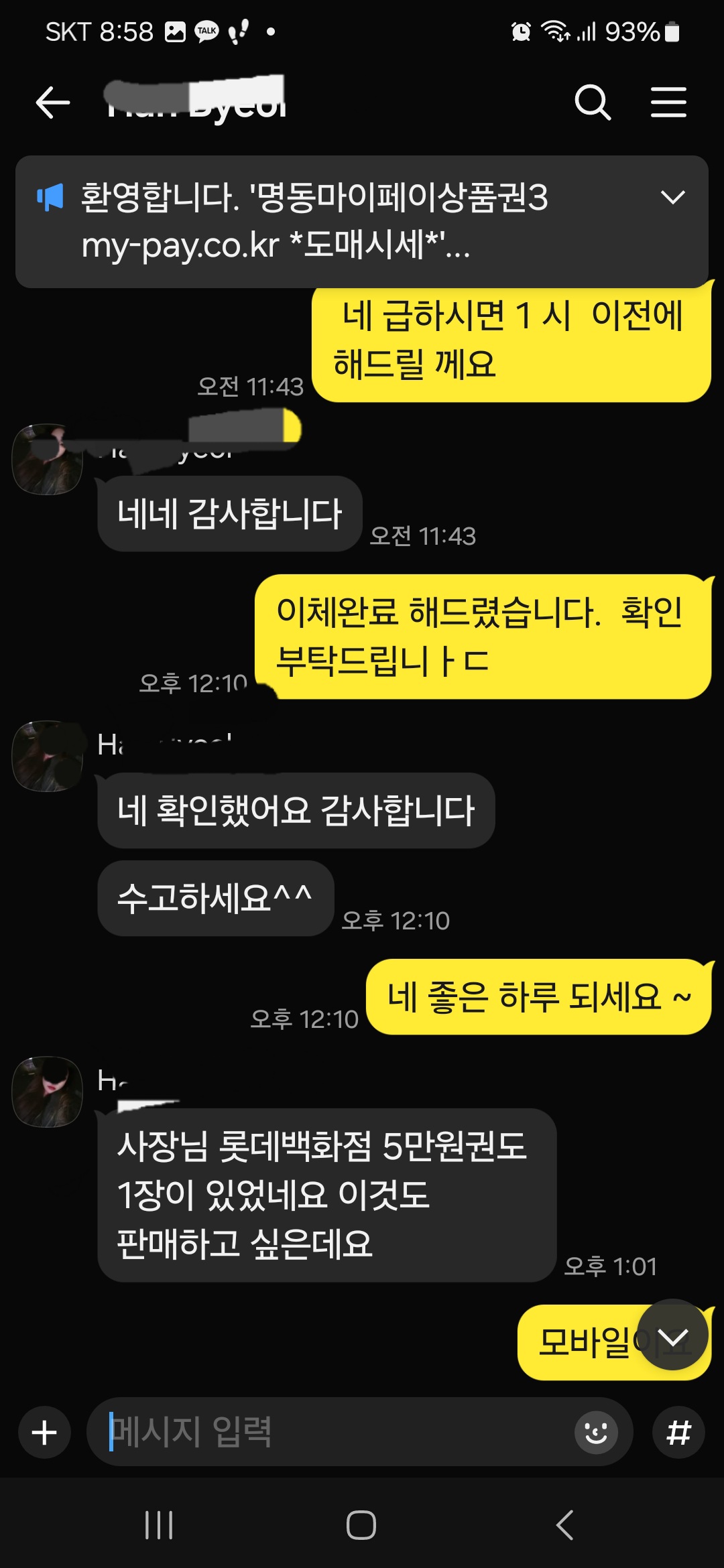 이마트·롯데 모바일상품권 카톡 문의 후 즉시 거래 완료!